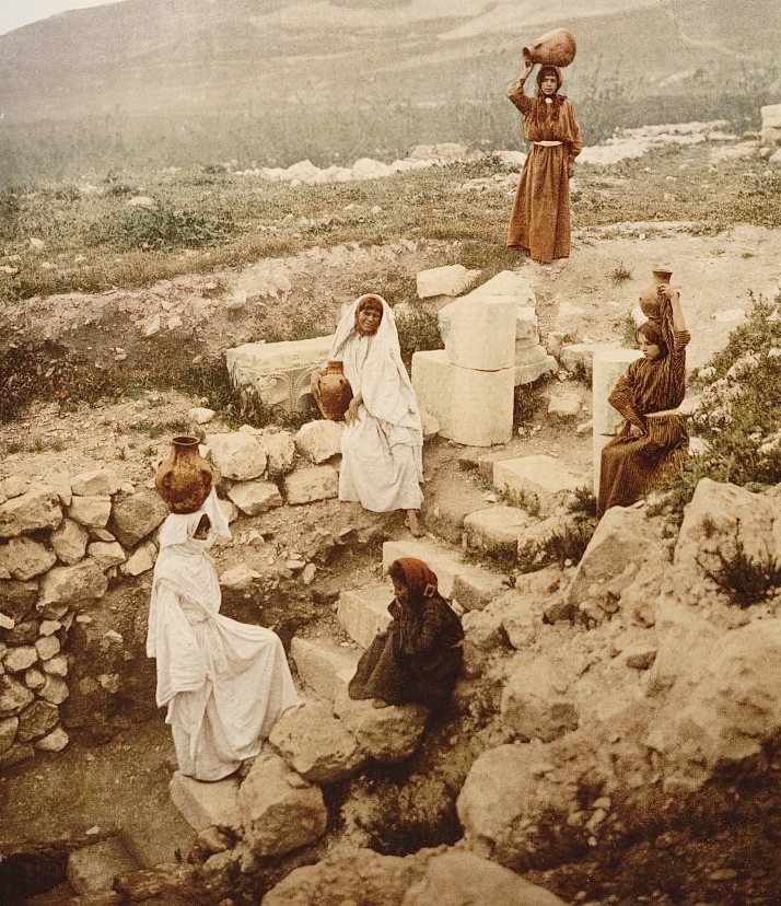 Women gathered around the well of the Samaritan (Shechem), Nablus, West Bank. A photograph taken around 1890-1900. Abraham’s servant Eliezer first met Rebekah, who would become Isaac’s wife, at a well (Genesis 24:10-28). Jacob first met his wife Rachel by a well, too (Genesis 29:1-12).