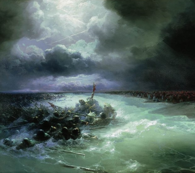 Detail from Passage of the Jews through the Red Sea painted by Ivan Aivazovsky. This scene depicts the Egyptians floundering and drowning in the Red Sea, whilst God’s people, safe on dry land, look on.