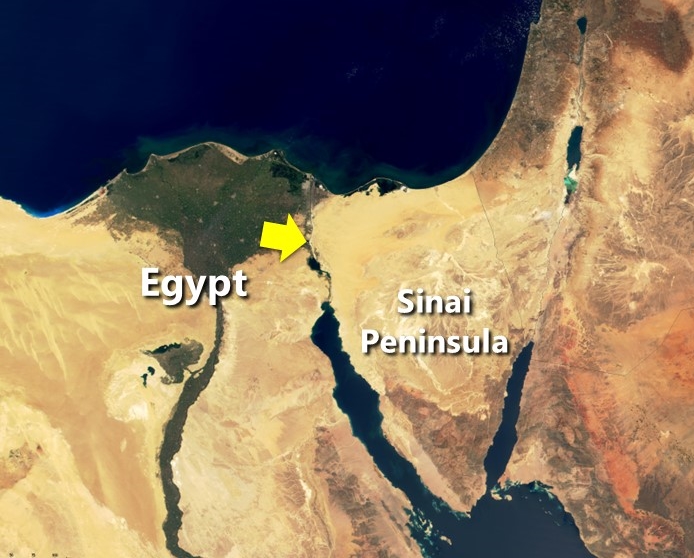 A satellite image of the Middle East. The yellow arrow shows the location where the Israelites may have crossed the Red Sea (at the position of present-day Lake Timsah).