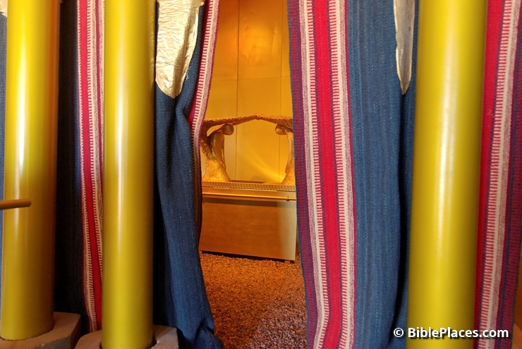 The Interior of the full-scale replica of the Tabernacle, Timna Park, Israel. Here, the curtain at the far end of the Holy Place is pulled aside to reveal the Ark of the Covenant in the Most Holy Place.