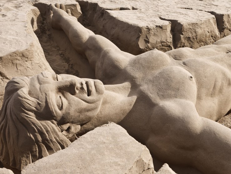 Sand sculpture of Adam. God shaped Adam’s body from the dust of the ground. Then He breathed into this body “the breath of life”.