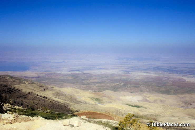 View of the Plains of Moab and the Dead Sea from Mount Nebo. This was the mountain from which God showed Moses the Promised Land. We read, “Then Moses went up from the plains of Moab to Mount Nebo, to the top of Pisgah, which is opposite Jericho. And the LORD showed him all the land, . . . .” (Deuteronomy 34:1.)