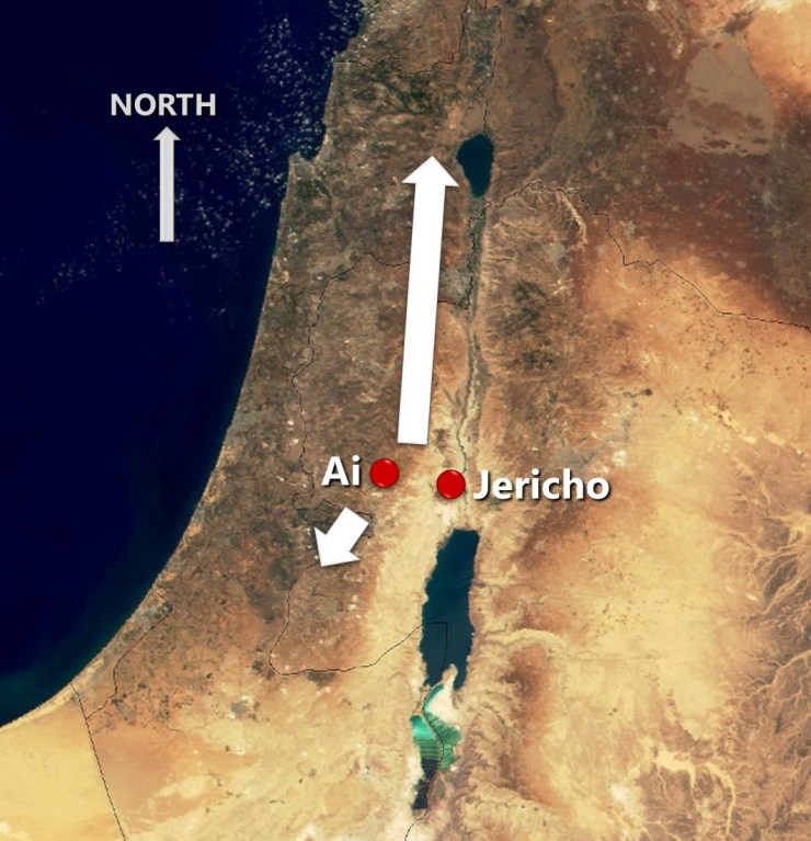 Map showing the position of Jericho and Ai in the centre of the Promised Land, and the general direction of the southern and northern campaigns.
