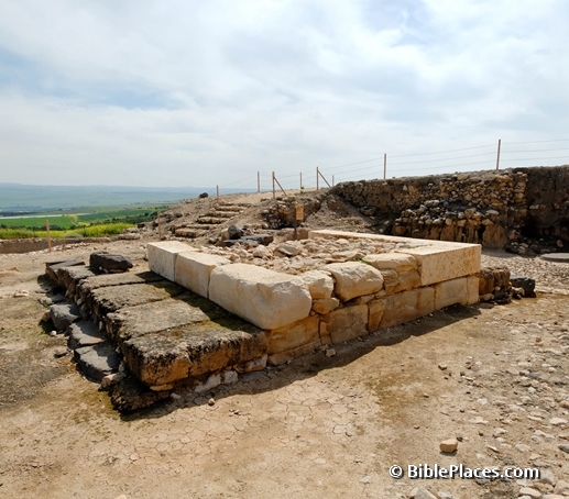 The partially reconstructed remains of a Canaanite altar at Hazor, a key Canaanite stronghold. Joshua and his warriors defeated “a great horde” of northern Canaanites, led by Jabin, king of Hazor (Joshua 11:1-9). Then “Joshua turned back . . . and captured Hazor and struck its king with the sword, . . . . And they struck with the sword all who were in it, devoting them to destruction; there was none left that breathed. And he burned Hazor with fire.” (Joshua 11:10-11).