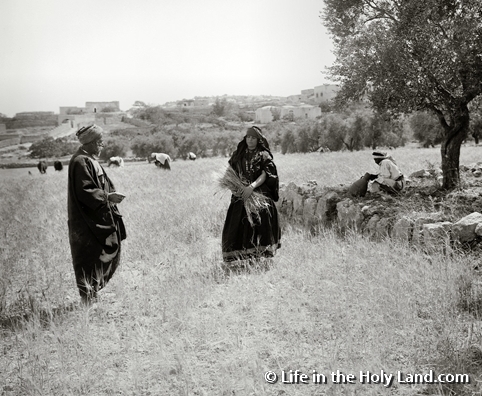 This image is one of a series of early photographs of a re-enactment of the story of Ruth, the great-grandmother of King David. The photographs were taken between 1898 and 1946. This scene seems to capture the moment when Boaz speaks to Ruth, saying, “Now, listen, my daughter, do not go to glean in another field . . . , but keep close to my young women. Let your eyes be on the field that they are reaping, . . . . And when you are thirsty, go to the vessels and drink what the young men have drawn.” (Ruth 2:8-9).
