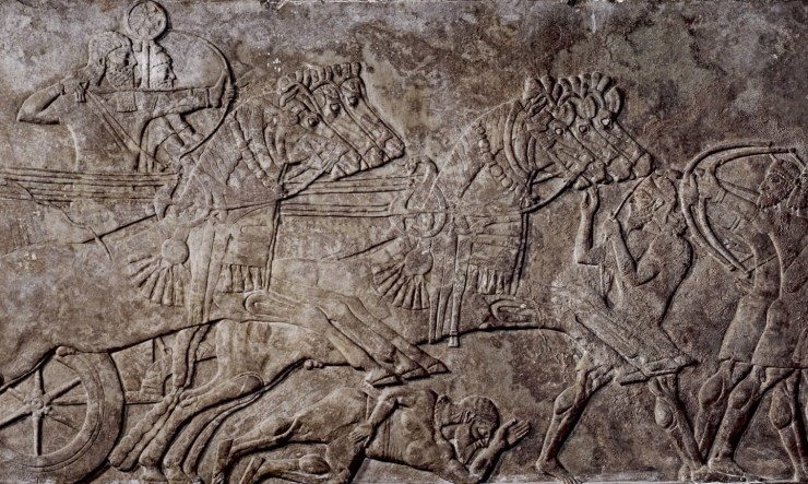A wall panel showing Assyian chariots charging into battle. It’s dated to the time of Elijah. About 130 years later, the Assyrians overran the northern kingdom of Israel.