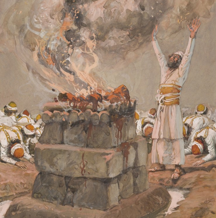 Fire from Heaven Consumes the Sacrifice painted by James Jacques Joseph Tissot. In 1 Kings 18:20-40 we read that Elijah gathers 450 prophets of the false god Baal at Mount Carmel. He sets a contest involving two sacrifices. One is offered to Baal by his prophets; Elijah offers another to the Lord. The Lord alone is able to send fire: this painting captures the scene when “the fire of the LORD fell and consumed the burnt offering” (1 Kings 18:39).