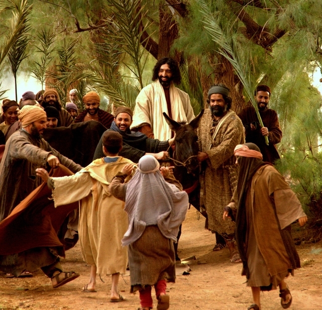Joyful crowds give a royal welcome to Jesus as He makes His triumphal entrance into Jerusalem, days before His crucifixion. An image from the LUMO Project’s Gospel for the Visual Age. We read: “Most of the crowd spread their cloaks on the road, and others cut branches from the trees and spread them on the road. And the crowds that went before him and that followed him were shouting, ‘Hosanna to the Son of David! Blessed is he who comes in the name of the Lord! Hosanna in the highest!'” (Matthew 21:8-9). The cry “Blessed is he who comes in the name of the Lord!” is a quotation of part of Psalm 118:26.