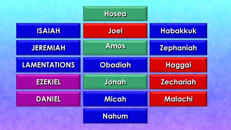 The chart below lists the 17 books written by these prophets. Those in capitals are called ‘major prophets’, because they wrote longer books. Lamentations, although a short book, is included here, as it may have been written by Jeremiah. The other twelve books are shorter, so their writers are called ‘minor prophets’. The books shown in green boxes were written by prophets in the northern kingdom of Israel; those in blue boxes by prophets in Judah. Ezekiel and Daniel, shown in purple boxes, prophesied during the exile in Babylonia. And the four shown in orange boxes prophesied after Judah’s return from exile (it isn’t certain when Joel was written, but it was probably after the exile).