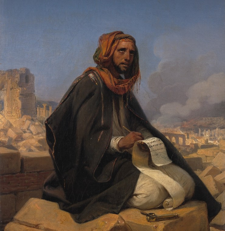 Jeremiah on the ruins of Jerusalem painted by Horace Vernet. Jeremiah himself lived through the destruction of Jerusalem by the Babylonians, and tells us about it in Jeremiah 39:1-14.