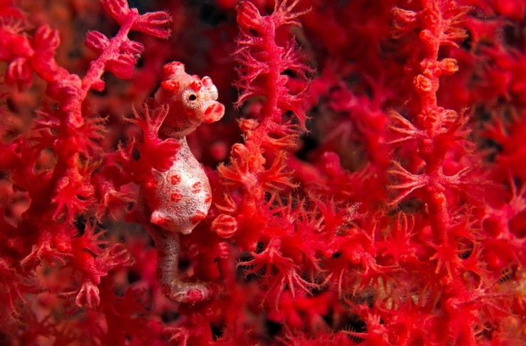 This little creature, towards the left-hand side of this photograph is actually a fish – a pygmy seahorse. It’s less than an inch long, a little miracle of the sea, brilliantly camouflaged in this fan coral.