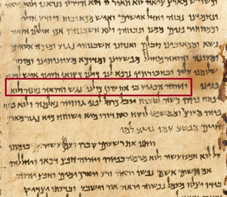 A portion of a photo of the Great Isaiah Scroll, one of the Dead Sea Scrolls. This photo shows part of Isaiah 53. The portion highlighted reads “the Lord has laid on him the iniquity of us all” (Isaiah 53:6). This manuscript was probably written around the second century BC, many decades before Jesus fulfilled this prophecy.