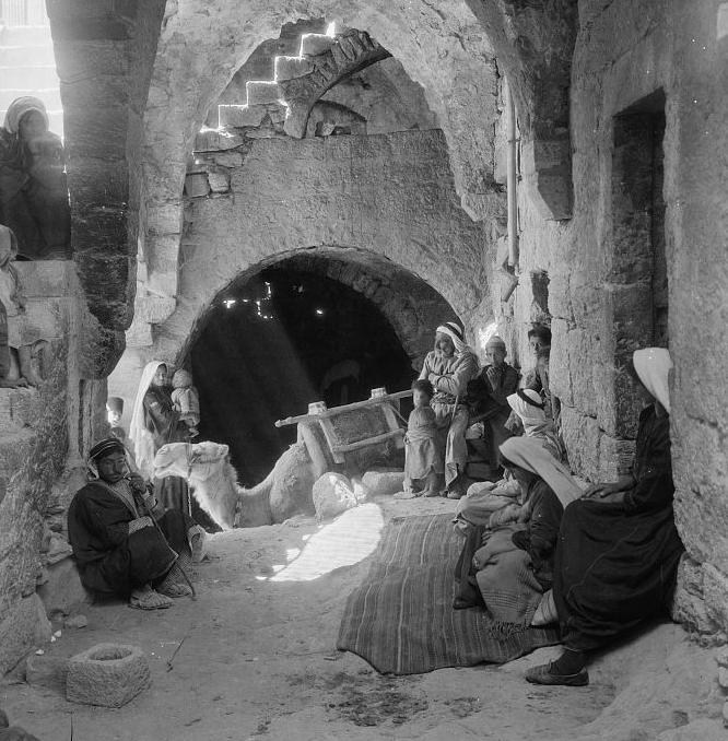 A photo (taken between 1934 and 1939) of a traditional Middle Eastern house at Beit Sahur, now a Palestinian house east of Bethlehem. Notice the camel in the background, seemingly almost part of the family! This house may be rather like the kind of house that Jesus may have been born in.