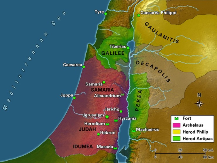 Palestine and the regions to the north-east in Jesus’s time, showing Galilee, Judea, Perea, Decapolis, and Gaulanitis.