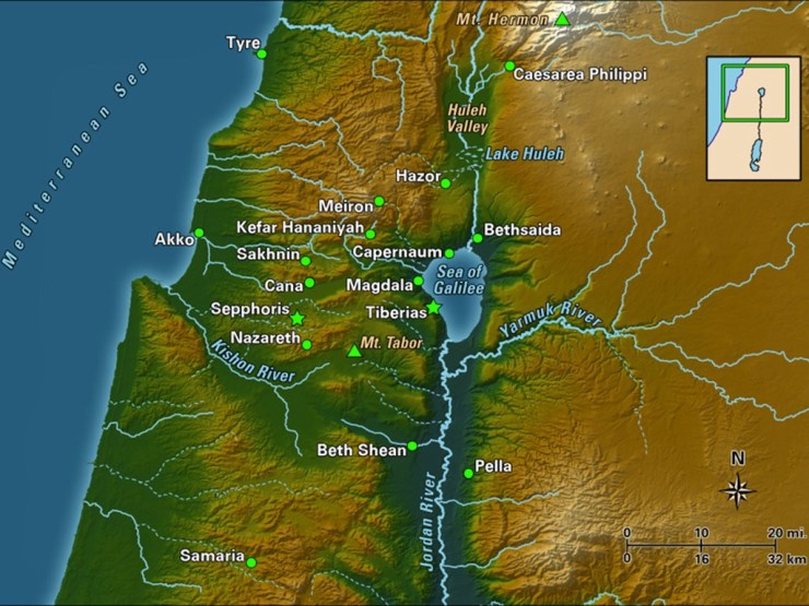 Map showing northern Palestine, including Nazareth, Cana, the Sea of Galilee, Capernaum, Bethsaida and Caesarea Philippi, all mentioned in the Gospels.