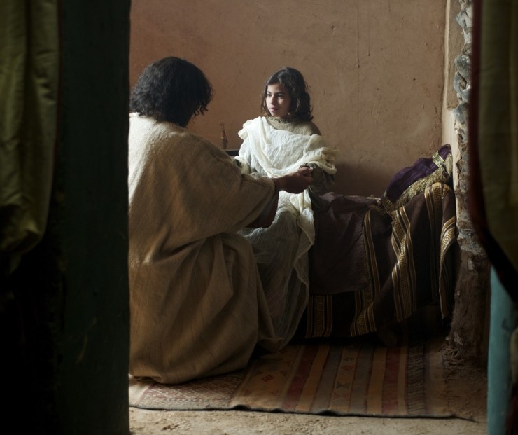 Jesus healing Jairus’s daughter. “Taking her by the hand he said to her, ‘Talitha cumi’, which means, ‘Little girl, I say to you, arise.’ And immediately the girl got up and began walking (for she was twelve years of age), and they were immediately overcome with amazement.” (Mark 5:41-42).