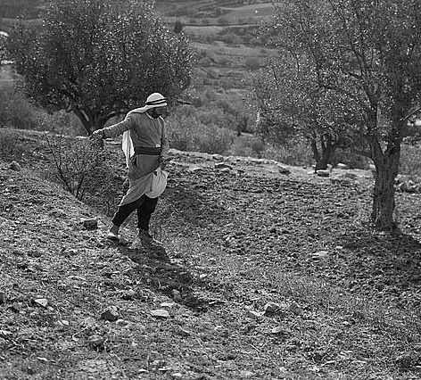 “And he told them many things in parables, saying: ‘A sower went out to sow'” (Matthew 13:3). This is a photograph of a farmer sowing seed in the traditional way near Jerusalem, taken between about 1920 and 1933.