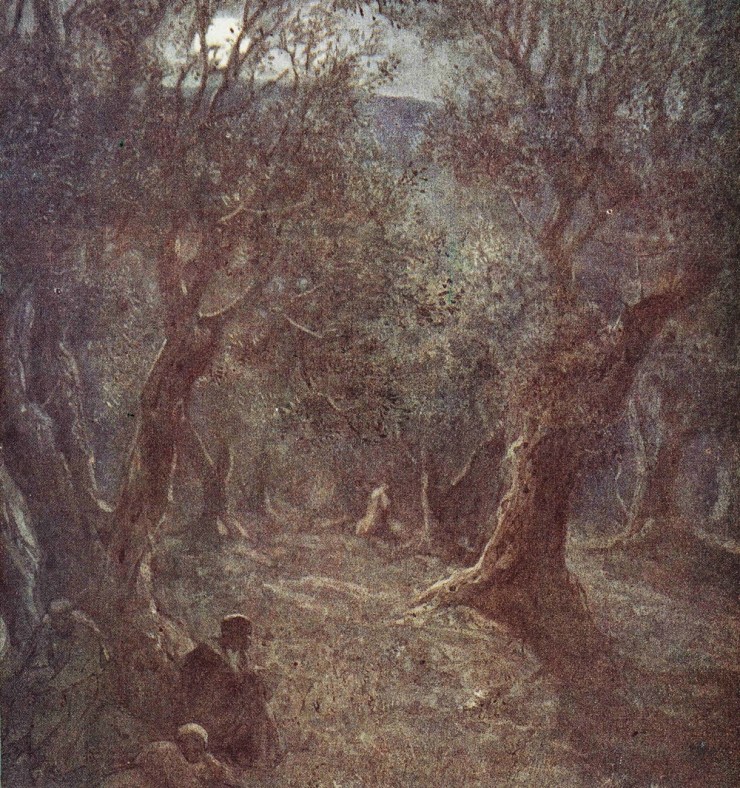 Jesus praying in the Garden of Gethsemane: a painting by William Hole. Jesus is seen in the middle distance in the centre of the painting; the disciples are seen at the bottom left. The Passover was around the time of the full moon, which throws a silvery light over the solemn scene.