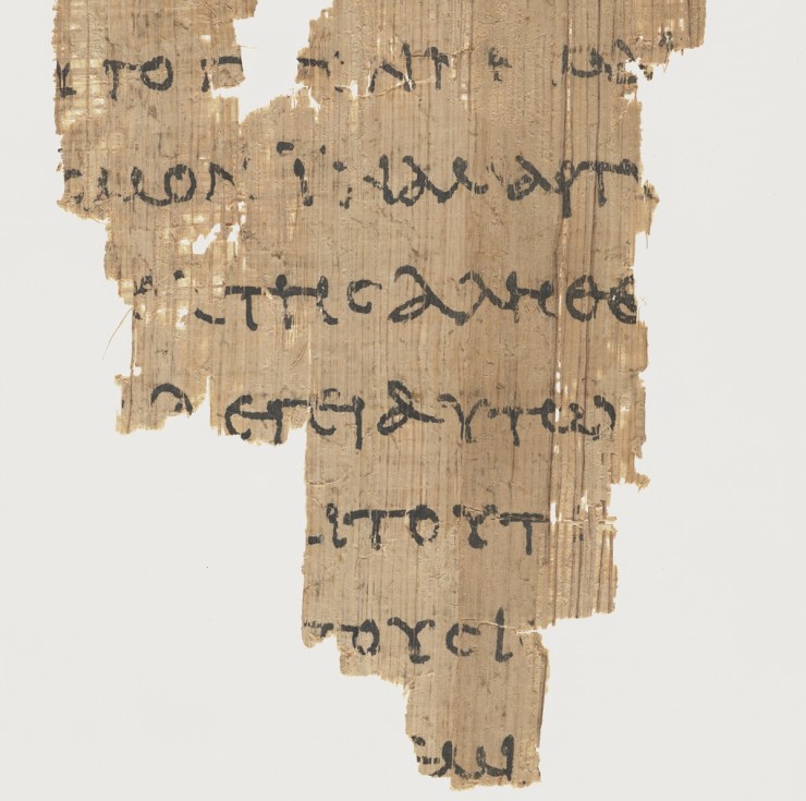 A portion of Rylands Library Papyrus P52, that’s been dated to around AD125-175 (only 45-95 years after John wrote his Gospel). It may well be the earliest New Testament manuscript yet found. The image shows a fragment of the Greek text of John 18:37-38.