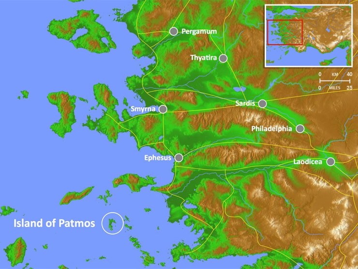 Map showing the seven cities of Asia Minor, where the seven churches of Revelation were located. It also shows the position of the island of Patmos. The seven churches are addressed in the order that a messenger might travel to deliver the book to each church.