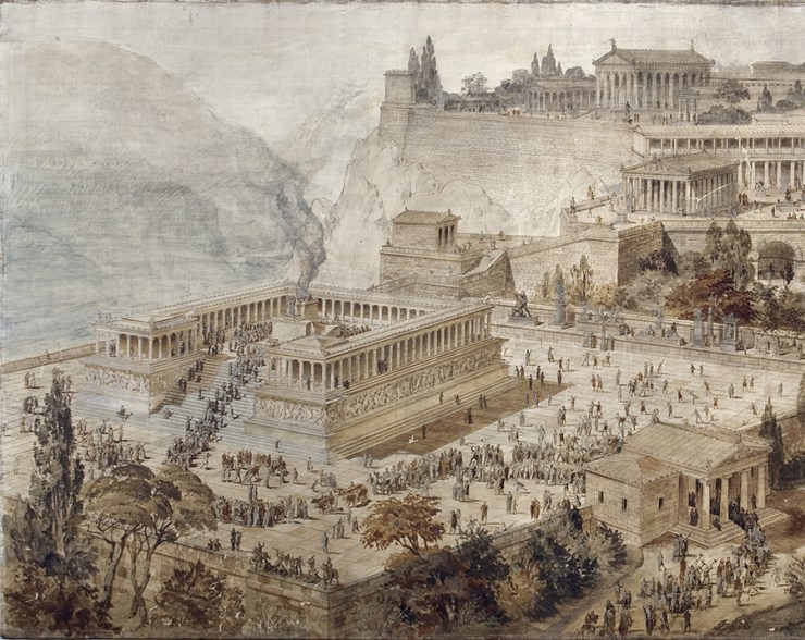 Detail from a reconstructed view of the acropolis of Pergamon. The acropolis was an imposing hill, on which stood various civic buildings. This reconstruction was based on the first published findings of the excavators; it gives a very good idea of what it may have looked like. To the left in the foreground is the great Pergamum Altar; above it and to its right, is the temple of the goddess Athena, with a colonnaded building behind it. Above that and a little to the left is the Temple of Trajan, one of the Roman Emperors. Both the Pergamum Altar and the Temple of Athena were in existence when Revelation was written; the Temple of Trajan was completed only a few decades later (in AD 128).