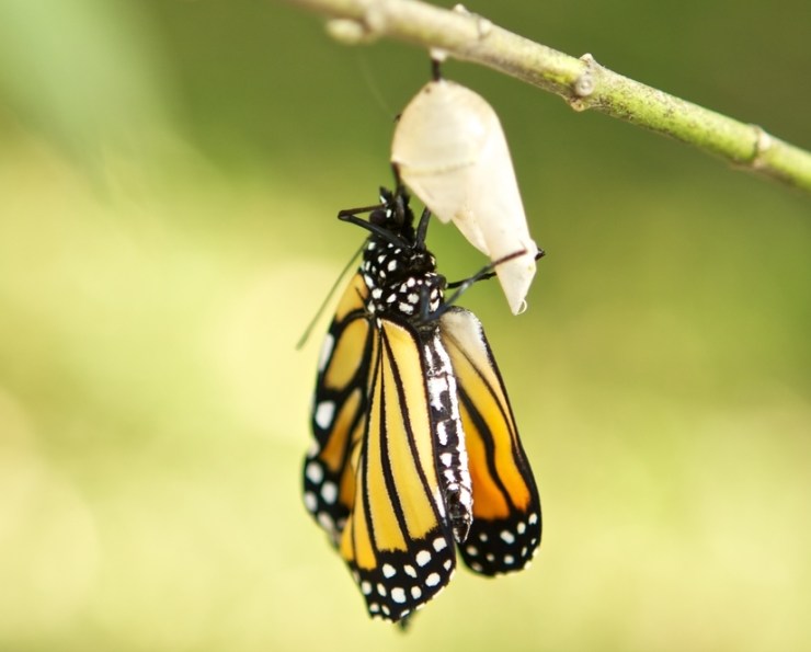 A caterpillar pupates and becomes a chrysalis, in which the caterpillar’s body is broken down and then reconstituted into the butterfly. This monarch butterfly is emerging from its chrysalis case.