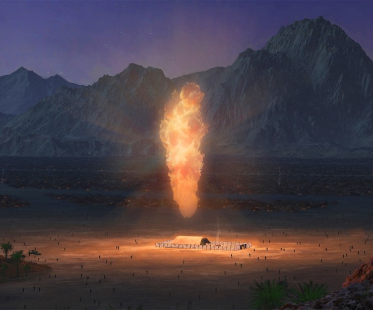 An artist’s impression of the Tabernacle in the wilderness at night. The pillar of fire, a visible manifestation of God’s presence, rests above it. Only the high priest could enter the Most Holy Place in the Tabernacle―and later in the Temple―and only under the strictest conditions. But in the new creation, all God’s people live there! They all live in the presence of God.
